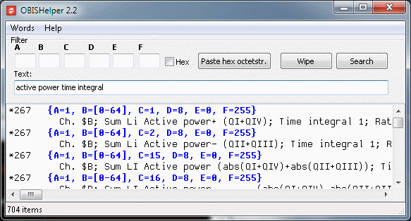 Using OBISHelper, we search for codes with ''active power'' and ''time integral'':