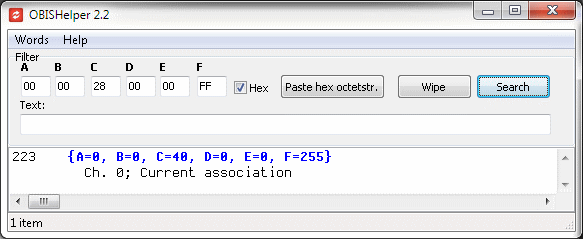 A logical name consists of a string of 6 values defined according to a system called OBIS for Object Identification System. OBIS allows to uniquely identify each of the many data items used in the energy metering equipment. The list of all possible OBIS codes (OBIS code is another name for logical name) is managed by the DLMS Users Association in a dense Excel document. We have a simple tool, called OBISHelper, able to find and identify the OBIS codes in a more comfortable way. Then, what is the logical name of the active energy ''object''?