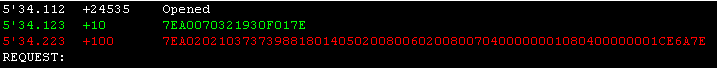 In EZReader when we click ''Connect'', the library routine HDLCConnect sends a SNRM-frame to the server. The server responds with an UA-frame. The next picture shows the resulting frame exchange. The green frame is the SNRM-frame and the red is the UA-frame: